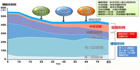 NREM期均從1期開始,1期為1~7分鐘,占總總睡眠的2~5%,這個(gè)時(shí)期易驚醒;2期持續(xù)10~25分鐘,每個(gè)循環(huán)逐漸延長,占總睡眠的45~55%,驚醒需要很大的刺激;3、4期兩期睡眠常合稱為慢波睡眠(sws)δ睡眠或者深睡眠,慢波活動占據(jù)50%以上,需要更大的刺激才能導(dǎo)致覺醒。 2,3,4期NREM期睡眠與主觀睡眠質(zhì)量有關(guān),也就是人們常說的昨晚睡得好不好。同時(shí)2,3,4期NREM期睡眠和REM期是記憶力鞏固的重要階段。 隨著年齡的增長,慢波睡眠逐漸減少,睡眠潛伏期時(shí)間延長。這也就是俗話“三十年前睡不醒,三十年后睡不著”的來源。 |